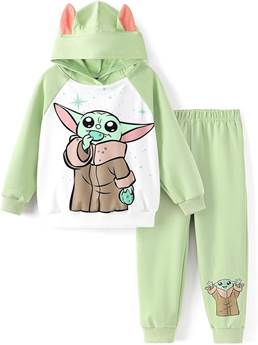 - The pullover hoodie features a colorful graphic of Baby Yoda (Grogu) in his signature robe, gently holding his favorite snack and exuding the irresistible charm that fans of all ages adore. The soft green fabric complements the playful design, with the hood shaped like Baby Yoda’s ears, adding a cute and fun element. The matching jogger pants complete the look with an additional graphic of Baby Yoda on the leg, creating a fun and coordinated outfit.